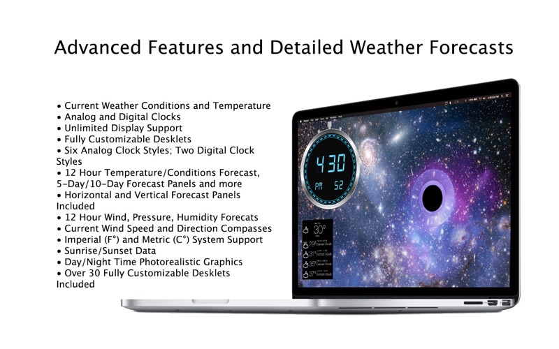 - Forecast Desklets show conditions, temperature, wind speed, humidity, and pressure for the next 12 hours